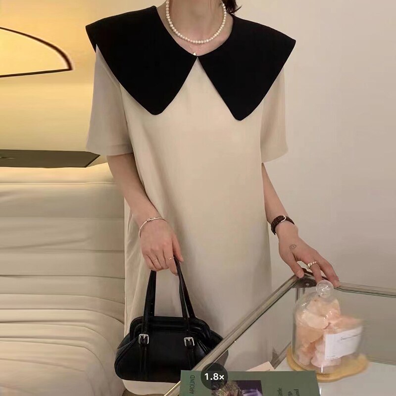 【送料0円】2色 レトロ風 リボン ワンピース 半袖 春夏 きれいめ 低身長 ワンピドレス 膝丈 ひざ丈 ミモレ ミモレ丈 Uネック ラウンドネック 襟付き 大きな襟 ワイドカラー でか襟 ビッグカラー ストレー